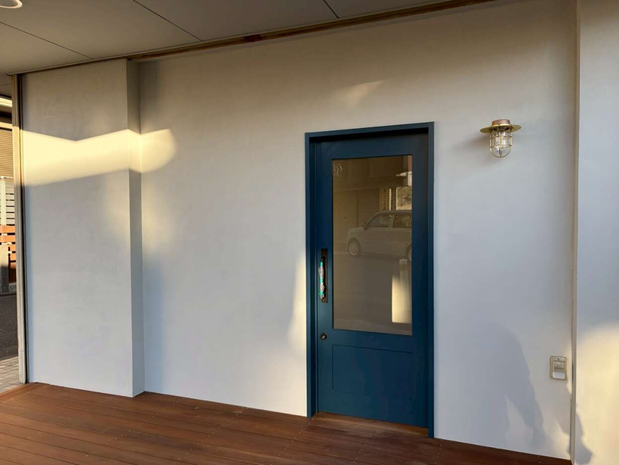 ▲ホワイトの塗り壁に、鮮やかなネイビーの扉が映えるエントランス。ウッドデッキのアプローチが、訪れる人を優しく迎え入れます。