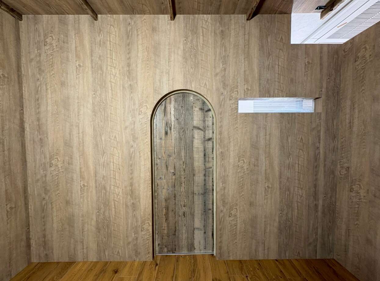 ▲壁一面を板張りに仕上げたインパクトのある空間。可愛らしくなりがちなアーチ開口も、素材が変わればこんなにクールに。